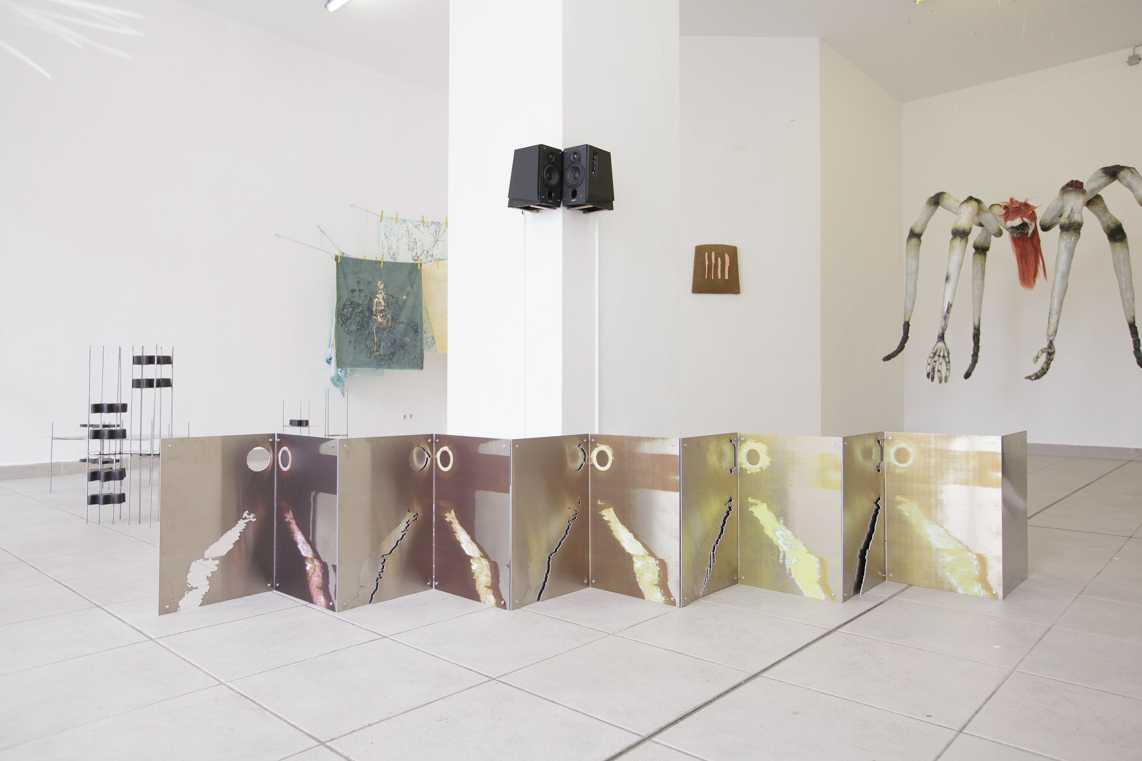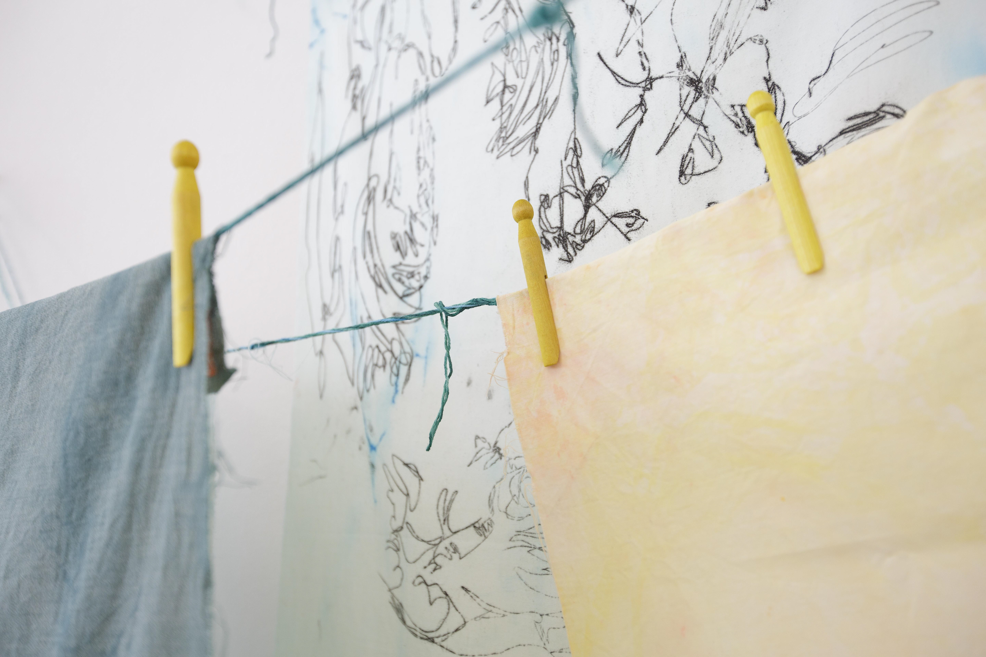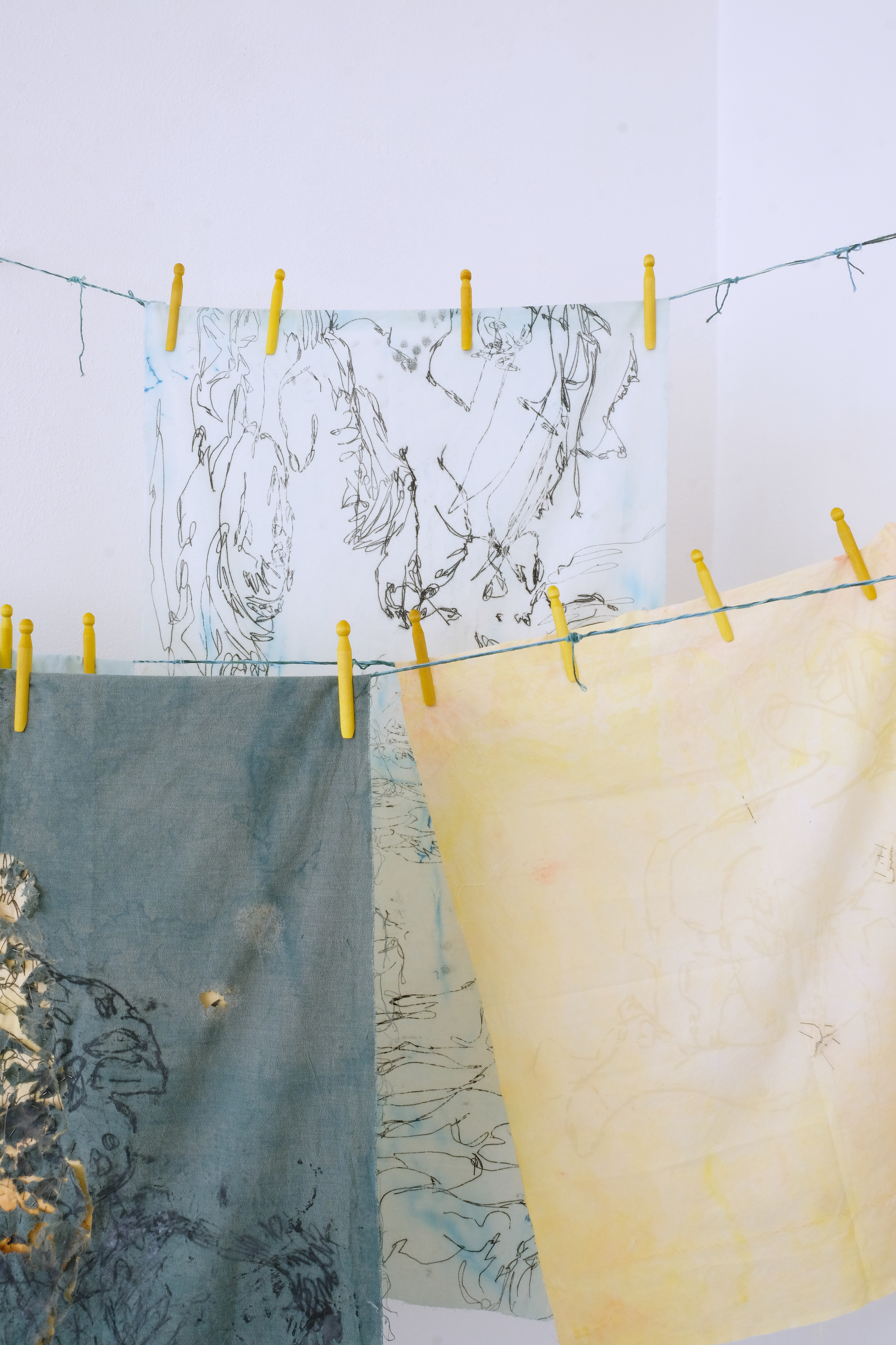 acid, dye, ink mono-prints, laser-cut cotton-blend fabrics, steel, water, wood, hand dyed woven cotton-blend rope